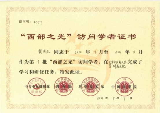 近日,中组部第十七批次“西部之光”访问学者、呼和浩特市蒙医中医医院樊海龙博士获颁“西部之光”访问学者证书。樊海龙博士表示:下一步将依托“石学敏国医大师传承工作室”,在院领导的支持下,落实好呼和浩特市人民政府“六大产业集群”建设项目之一“石学敏国医大师传承工作室建设项目”,把天美传媒