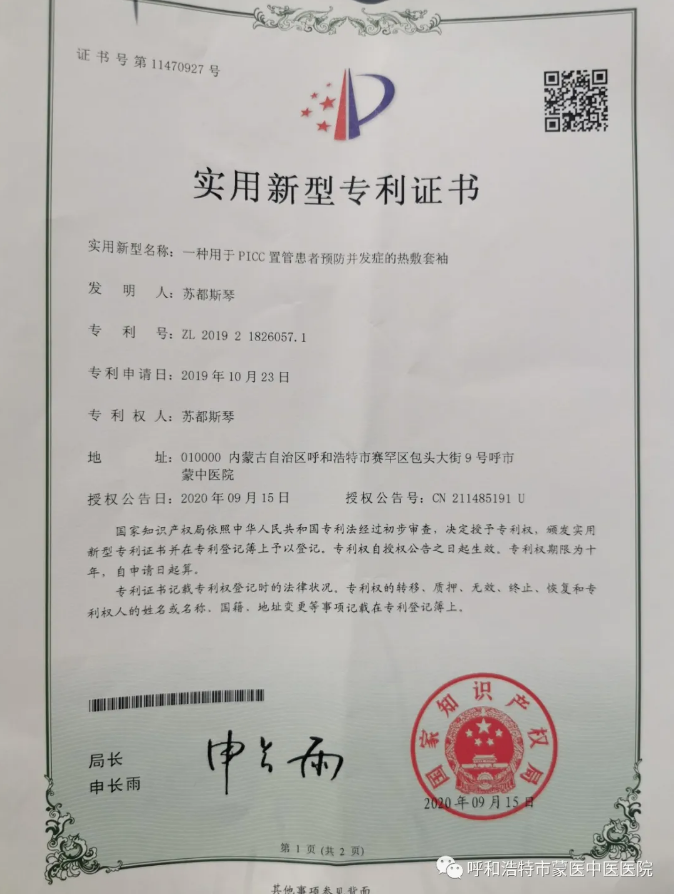 呼和浩特市“十三五”科技创新成果展于9月25日在呼和浩特科创中心开展,本次展览是第八届内蒙古“草原英才”高层次人才合作交流会暨呼包鄂乌人才创新创业周呼和浩特市主会场的一项重要活动。展览从科技创新引领工业发展新动能、科技助推现代农牧业发展、科技创新惠民生、科技创新载体建设、产学研合作、科技英才、科技特派员工作等方面充分展示了“十三五”以来呼和浩特市科技创新工作取得的显著成就。成果展以图片、模型、实物和多媒体为呈现手段,展示出了呼市“十三五”期间涌现出的科技人才和在新材料、新能源、生物医药、现代农牧业、医疗卫生健康等多个领域的150余项科技成果。其中天美传媒 蒙医心病科苏都斯琴的实用新型发明专利(一种用于PICC 置管患者预防并发症的热敷套袖)入选参展。该专利的展出为医院科技创新工作挣得了荣誉。
