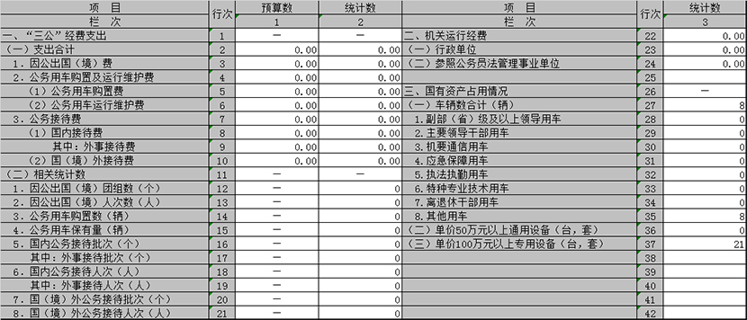 2.“三公”经费填列单位使用一般公共预算财政拨款安排的支出,其中:中央单位不包括教学科研人员因公出国(境)费及相关团组和人次,地方单位按照本级部门预算口径填报。预算数填列年初预算数,支出统计数应与财决08表保持衔接。“三公”经费相关统计数是指使用一般公共预算财政拨款负担费用的相关批次、人次及车辆情况。
